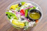 Fresh lettuce, green peppers, tomato, onions, black olive, feta cheese, and pepperoncini.